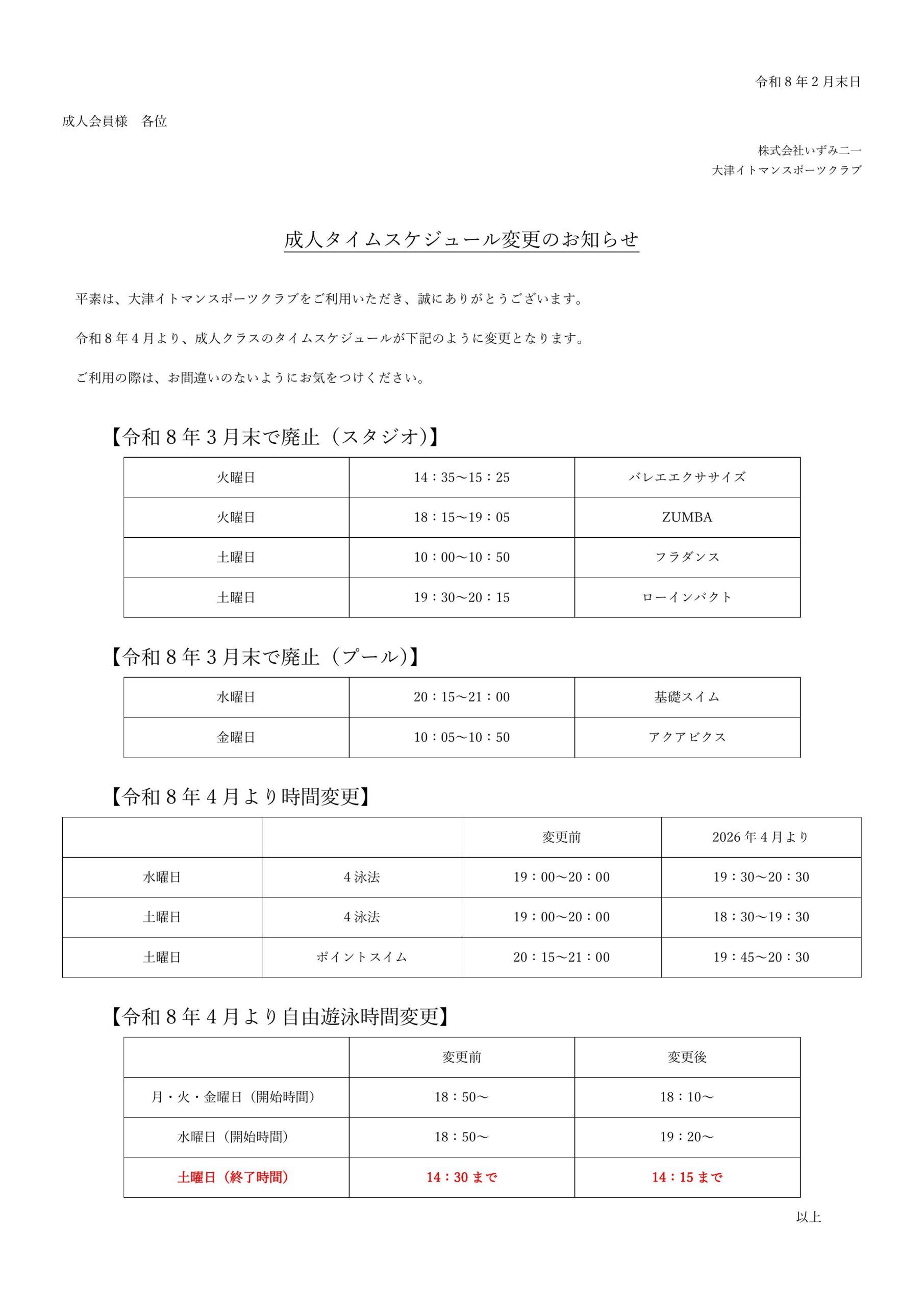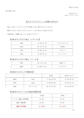【成人クラス】タイムスケジュール変更についてのお知らせ
